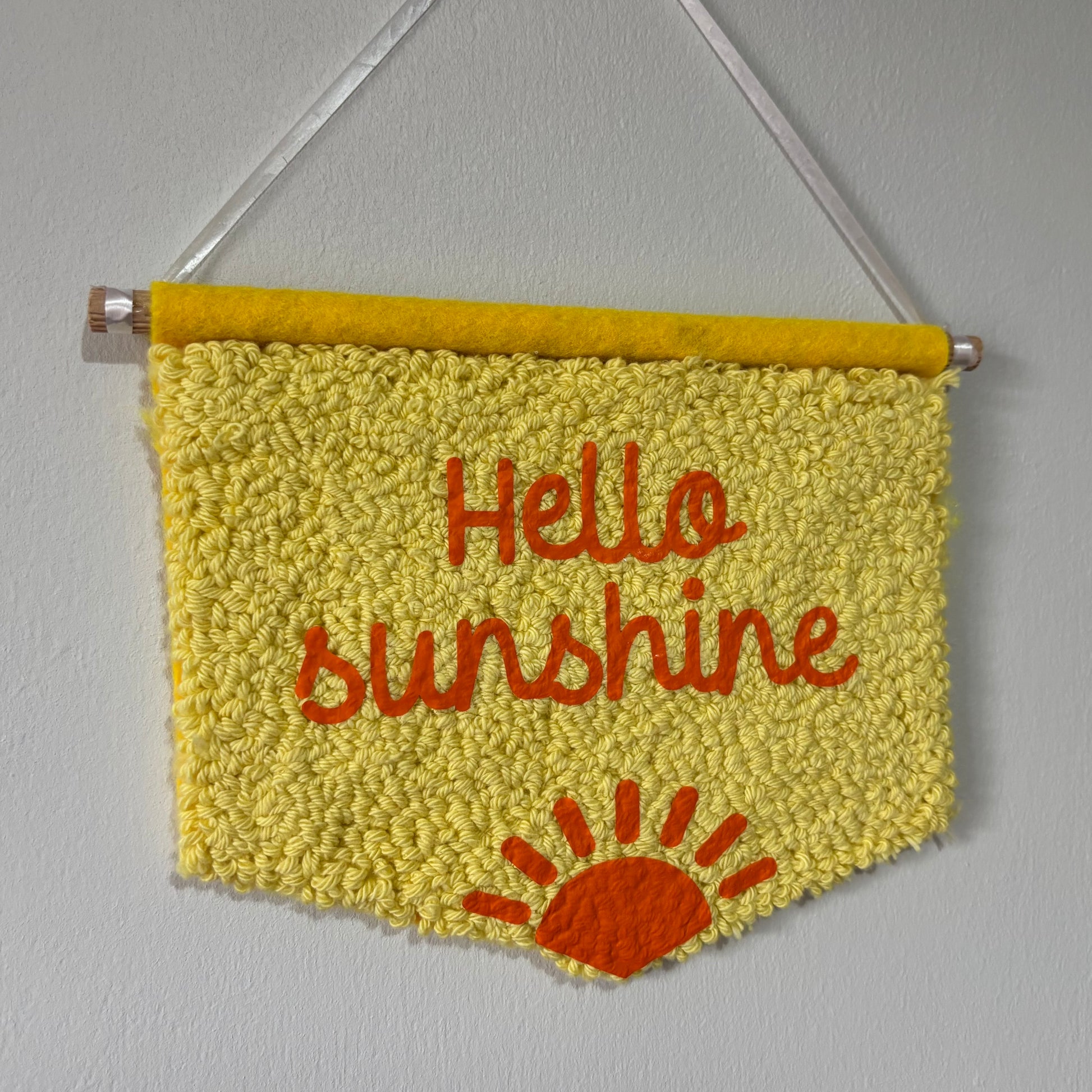 Punch needle banner displaying hello sunshine quote, made of yEllie yarn and backed with yellow felt.