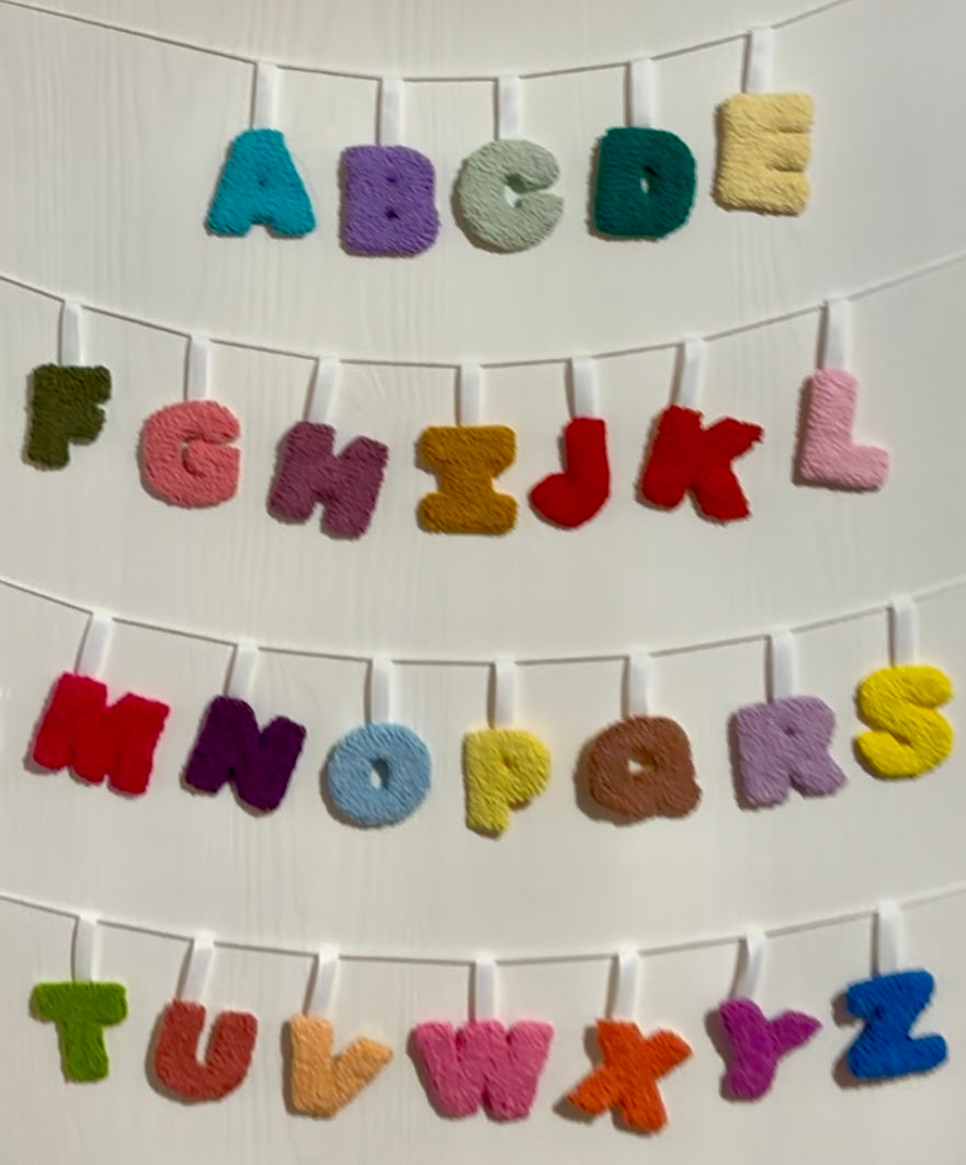 This listing is for initial designs, made of a yarn colour of your choice, and backed with a similar colour felt. Please note that the colours might look slightly different in person from the images shown.