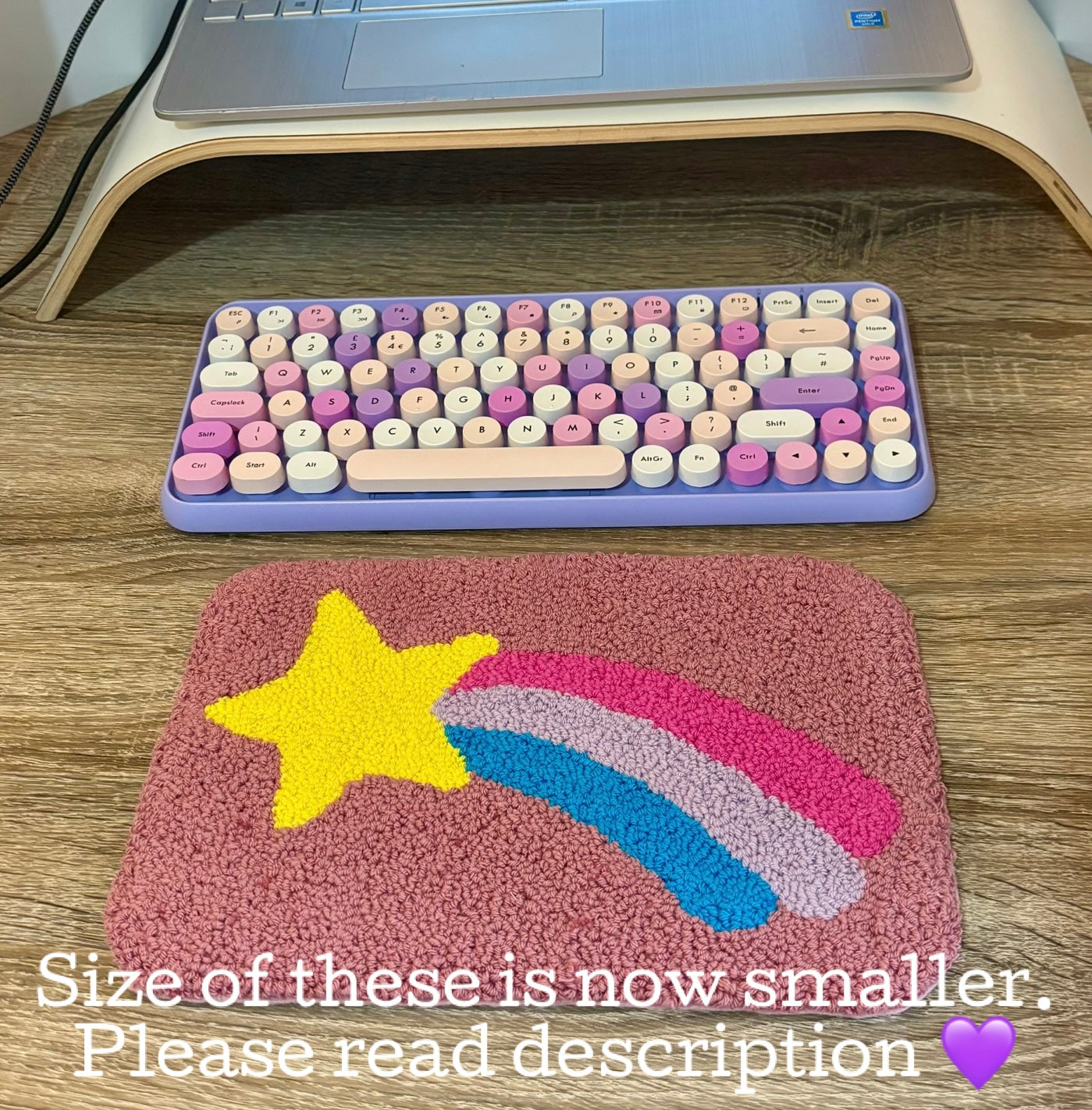 Punch needle desk mat with shooting star design, made using yellow, pink, purple and blue yarn. The mats are backed in felt, colour of the felt being similar to the design.